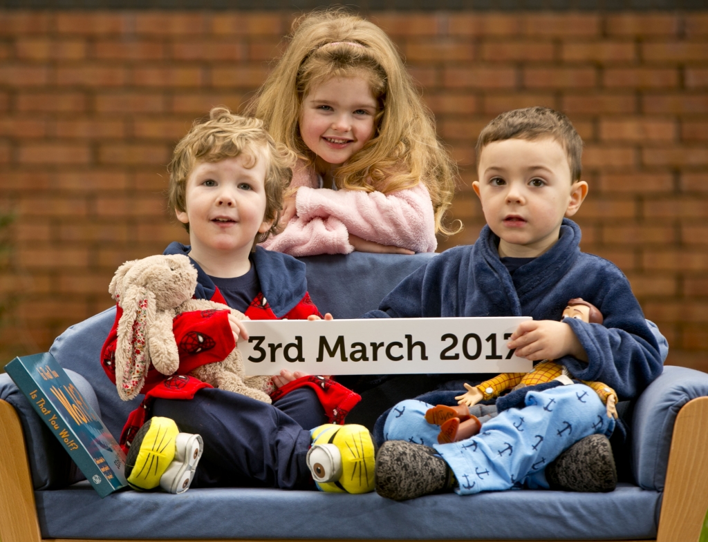 Photo Left to Right: Sebastian Staunton-Smith, Malahide; Hollyann Farrelly, Tallaght and Elliott Smith, Tallaght launch National Pyjama Day taking place on Friday 3rd March 2017, when 60,000 children are sponsored to wear their pyjamas into creche / preschool to raise money for children’s charities in a nationwide fundraiser that is all about children helping children and having fun.  More details www.earlychildhoodireland.ie